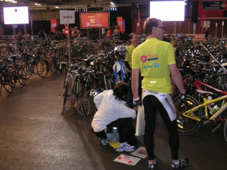 De auto hebben we ,zoals velen met ons, op het grasveld geparkeerd. De fietsen werden afgeladen en we konden naar de ingang fietsen. Dat was eingelijk wel de bedoeling, maar de fiets van Kees ( een bejaard model, maar in puike conditie) liet hem doortrappen. Nu denk je bij doortrappen dat je niet kan remmen met je pedalen, maar dit was contra. Door kracht uit te oefenen op zijn pedalen kwam hij niet verder dan de achterhoede van de groep mensen die naar de hal toe fietsten. Niet echt een positie waar we Kees op inschatten. De tandwielen op zijn achterwiel hadden geen grip. We hadden het onderweg naar de start nog over fietsenmakers die belangeloos hun diensten aanboden voor het goede doel. Bij de start stond een zo een fietsenmaker met zijn herstelbus.. Na een grondige inspectie van de fiets was de conclusie: kou. Nu was het inderdaad niet warm, maar door de kou was het vet een beetje harder en minder soepel dan gewenst. Hierdoor pakte het achtertandwiel niet altijd. Hij hoefde niet de brander erop te zetten, maar kreeg hem wel weer aan de praat. Ook de voorrem nog even bijgesteld en we waren klaar voor de strijd en het ontbijt.