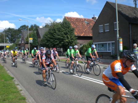 Nu nog fietsen….. Het fietsen is het probleem niet, maar om de 110 kilometer achter elkaar te fietsen op mijn randoneur,  is iets anders dan in een grote groep trappen met allemaal wielrenners. Dus ik heb de “stoute wielrenschoenen” aangetrokken en ben naar onze fietsenmaker gestapt. De firma van Rijn te Vrouwenakker was mij zeer behulpzaam. Een maand voor de “Ride” ben ik naar ze toe gegaan en heb gevraagd of ze wel eens racefietsen verhuren. Ik heb ze uitgelegd dat ik op mijn “bakfiets” misschien moeite zou hebben om het peloton bij te houden. Het antwoord was kom maar even 14 dagen van te voren dan kijken, dan zien we wel wat we hebben staan.